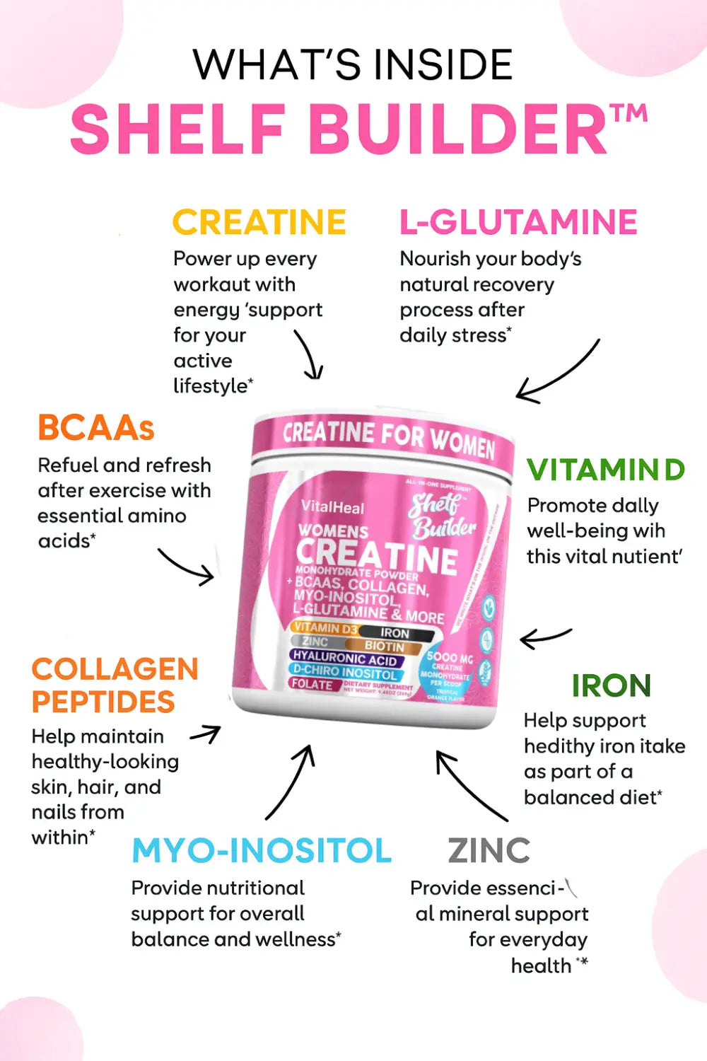 Our formula delivers a full-spectrum approach with creatine monohydrate, branched-chain amino acids, collagen peptides, myo-inositol, D-chiro inositol, L-glutamine, L-methylfolate, biotin, vitamin D3, iron, zinc, hyaluronic acid, maca root, and digestive enzymes.