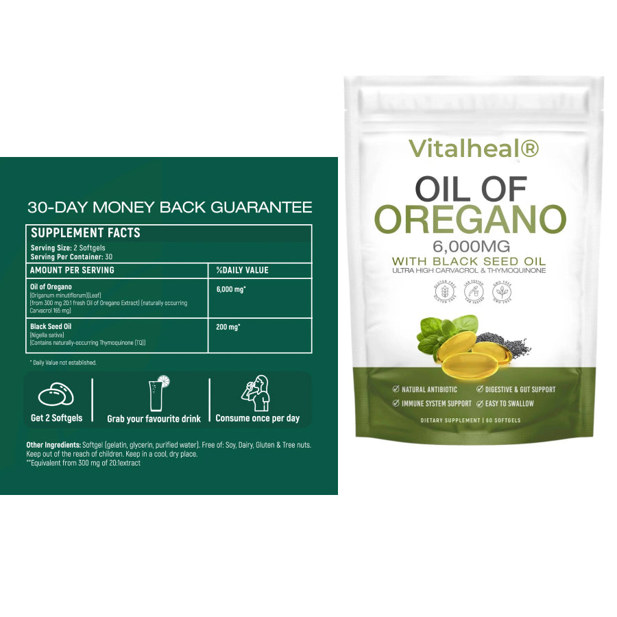 This powerful duo delivers a wide spectrum of natural wellness benefits — from stronger immunity to improved overall vitality. By combining Oregano Oil and Black Seed Oil, we've created a high-impact formula that supports multiple aspects of your health in one simple daily softgel.