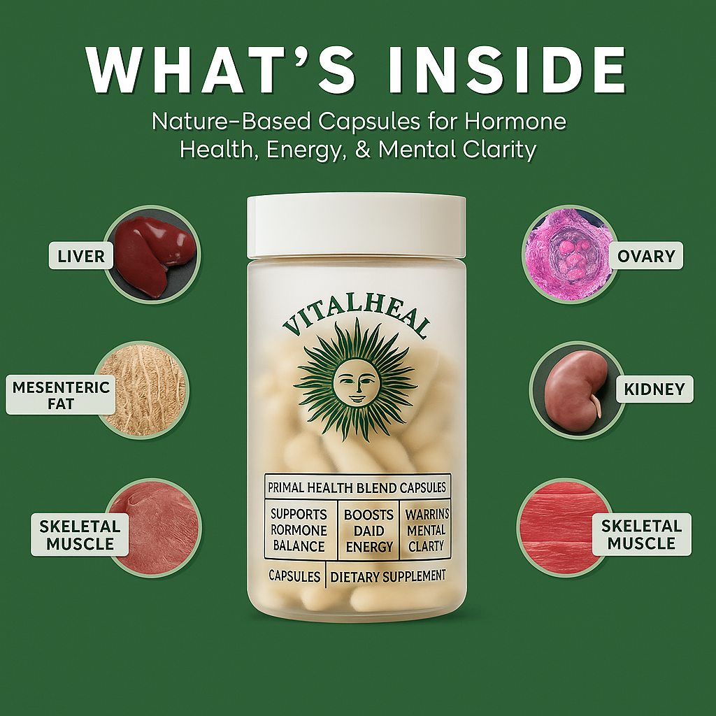 Primal Health Blend Capsules combine nutrient-rich extracts from liver, kidney, ovary, mesenteric fat, and muscle tissue to naturally support hormone balance, daily energy, and mental clarity. A premium ancestral supplement designed for women’s vitality, focus, and overall well-being — ideal for daily hormonal support, strength, and long-term health