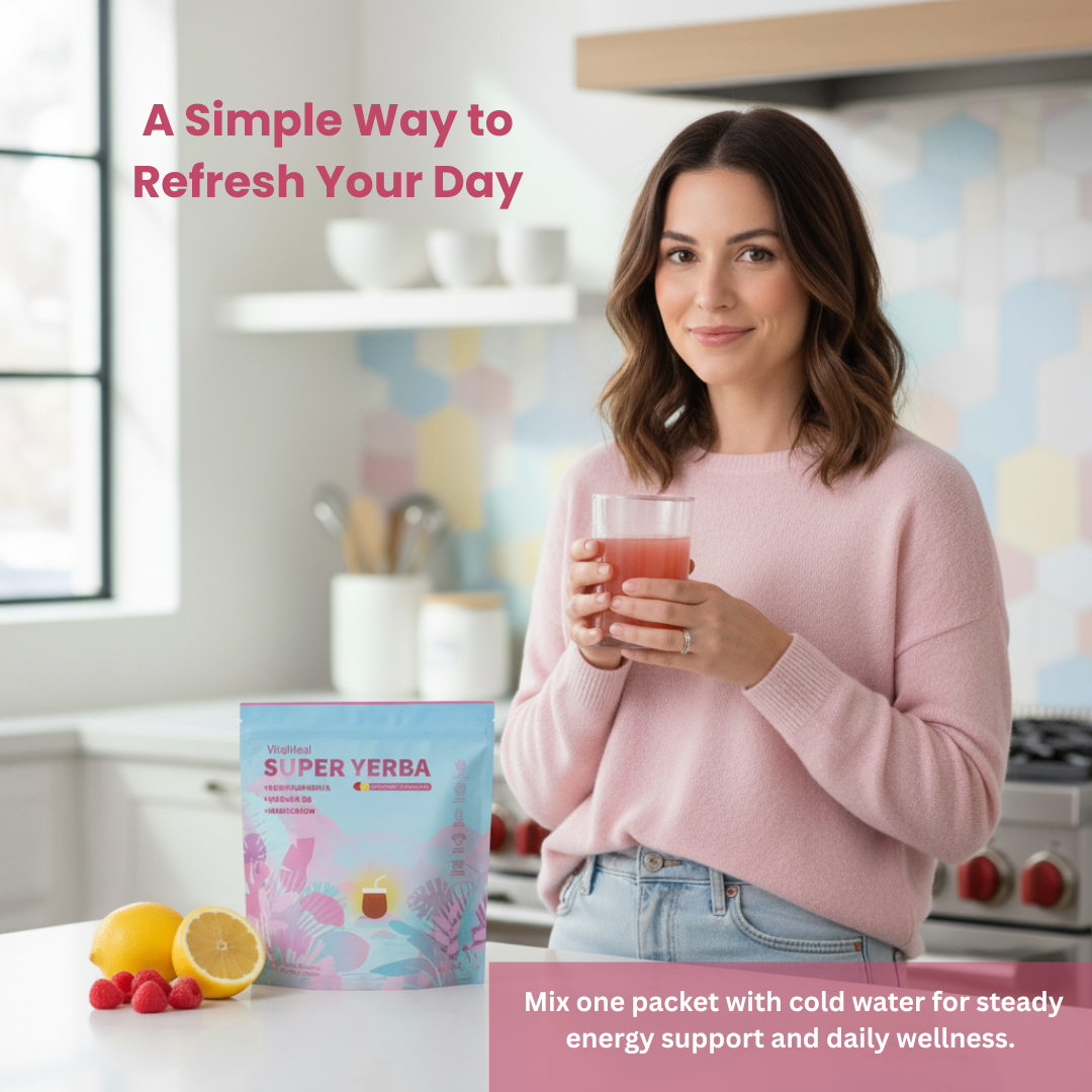 Super Yerba includes Yerba Mate Extract, along with functional ingredients such as Lion’s Mane, Alpha GPC, Bacopa, and Ashwagandha to help maintain mental clarity, concentration, and balanced mood support. It also features a Prebiotic + Probiotic Fiber Blend to support gut health and daily digestive balance. For overall wellness, the blend contains Magnesium Glycinate and Vitamin D3, helping maintain normal muscle function and everyday well-being — all in a refreshing raspberry lemonade drink mix.